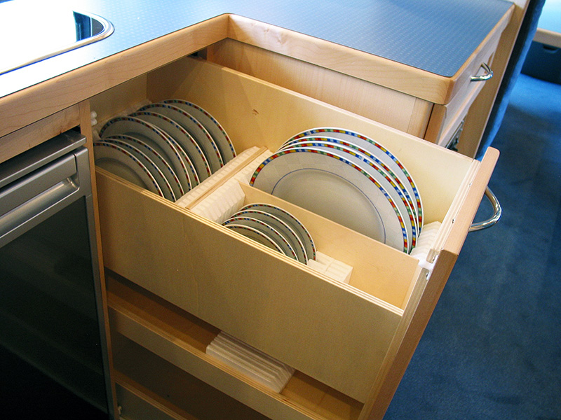 Sofern nur eine geringe Nutzlast für den Innenausbau zur Verfügung steht, können wir auch Möbel aus Sandwichplatten, die mit Holz oder Dekor beschichtet sind, fertigen. Diese Möbelplatten mit einem Schaum-Innenkern sind sehr leicht und doch sehr stabil.