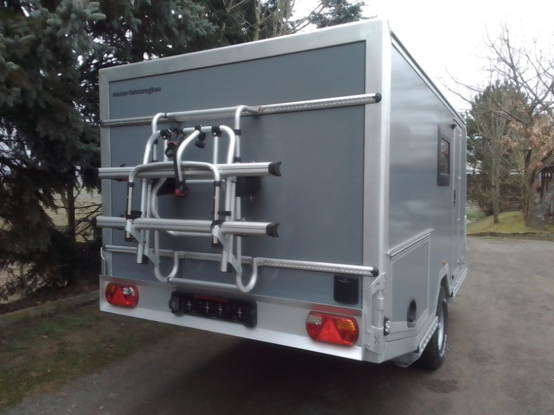 Die robuste Wohnkabine (Maße: ca. 4,00 m Länge, 2,10 m Breite und 2,05 m Höhe) wurde von uns nach Kundenwunsch gebaut. Der Innenausbau wurde großteils durch den Kunden realisiert und ist grundsätzlich für 2 Personen konzipiert; zwei Einzelbetten und zusätzlichem Doppelbett bei der Sitzgruppe. Als kleine Besonderheit besitzt die Kabine einen klappbaren Unterfahrschutz sowie einen abnehmbaren und elektrisch absenkbaren Fahrradträger am Heck, welcher z.B. für zwei E-Bikes geeignet ist.